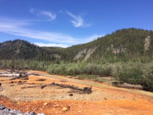 Die ersten vierzig Kilometer folgt man dem Klondike Highway und biegt dann auf den Dempster Highway ab. Hier haben wir das erste Mal abgekürzt und und bis zur Abzweigung mitnehmen lassen. Ich war etwas besorgt über die erste Tagesetappe auf dem Dempster, da das Höhenprofil ziemlich anstrengend aussieht; 72 km bergauf! Tatsächlich war es dann einfach eine stetige leichte Steigung und gar nicht so anstrengend. Die erste Etappe war wirklich schön! Christian meinte zwar «chli viu Böim für mi Gschmack» aber mir hat es sehr gefallen. Zum ersten Mal waren die Fichtenbestände etwas höher (Oberhöhe 30 Meter) – teilweise sah es aus wie im Oberland. Immer wieder konnten wir auch Biberdämme anschauen. Somit hatten wir diese typischen Kanadabilder mit Wasser, Wald, Bergen und Sonne.