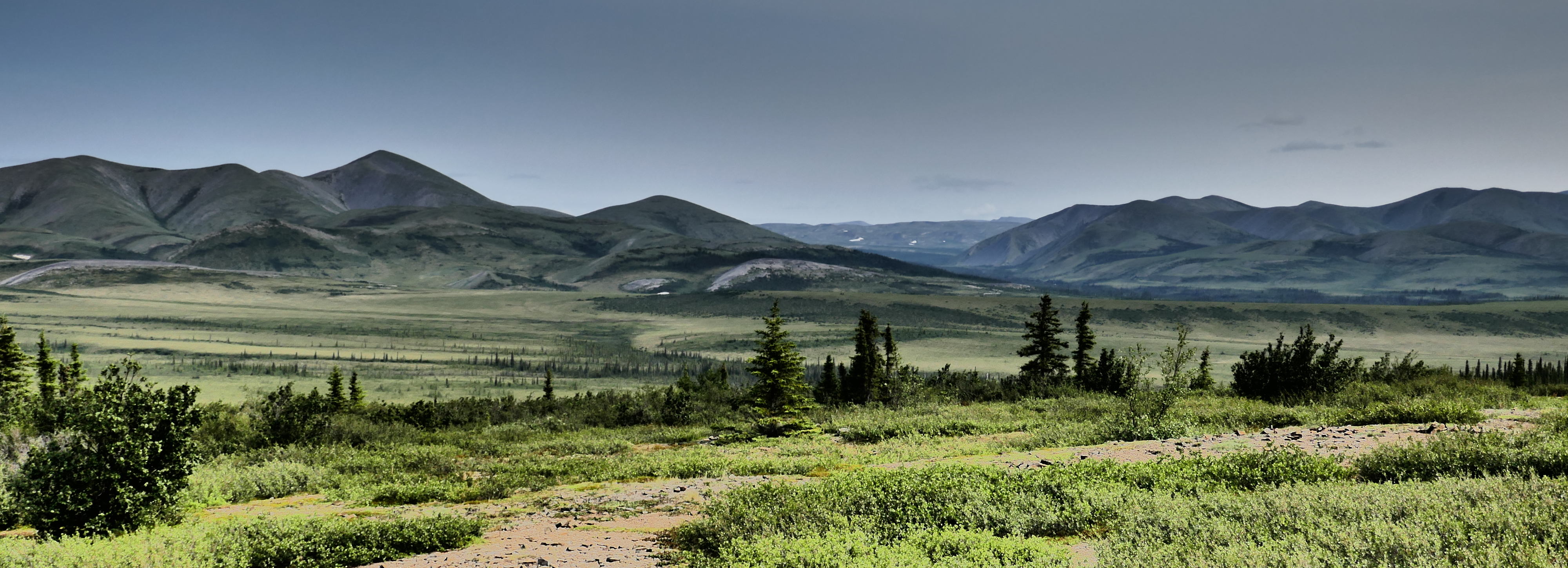 Nun stand ein mühseliger Tag an: mit unglaublich starkem Gegenwind ging es darum, den Wright Pass, die Grenze zu den Northwest Territories, zu erklimmen. Mit gut 4 km/h und regelmässigem Fluchen ging es dem Pass entgegen. Auf dem Pass wurde ich mit wunderbarer Aussicht auf die Northwest Territories belohnt. Wegen des Windes und der Kälte machte ich nur kurz halt und düste dann sofort mit sagenhaften 10 km/h den Pass runter. Auf halber Strecke traf ich die beiden French-Canadians welche versucht hatten den neuen Highway von Inuvik nach Tuktoyaktuk zu fahren. Leider mussten diese nach gut 30 km umdrehen, da sie im tiefen Schlamm stecken geblieben sind. Also hatte ich immer noch die Chance wohl der erste zu sein, der den Highway (der erst im November eröffnet wird) als erster mit dem Velo zu fahren!