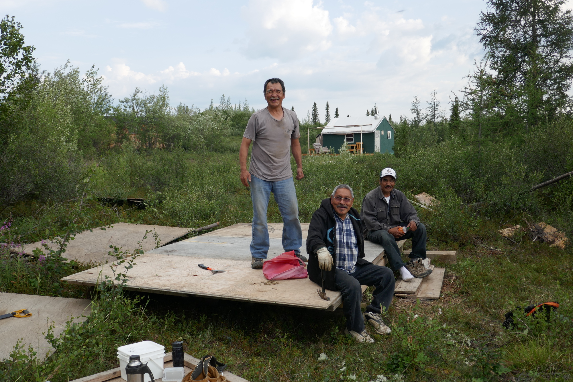 In Midway Lake traf ich auf Charlie und seine Freunde, welche für eben dieses Festival ein neues Häuschen bauten um dann während des Festivals darin zu wohnen. Ja genau, dort wird nicht gezeltet sondern man baut sich sein kleines Häuschen. Wir haben dann noch ein Bisschen am Häuschen gezimmert bevor es dann Fisch zum Abendessen gab.