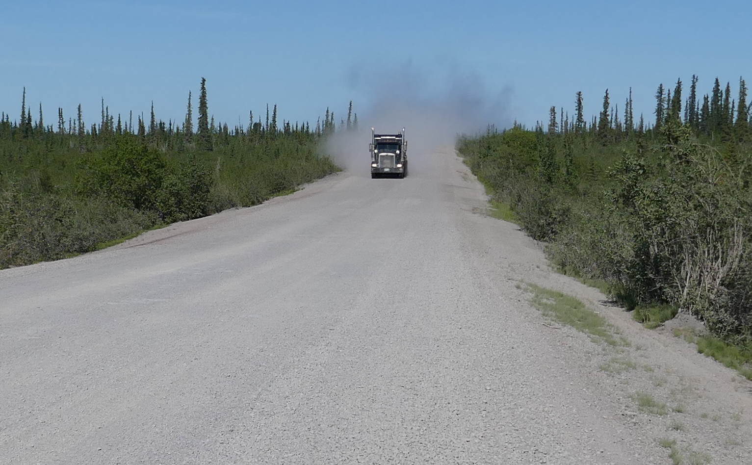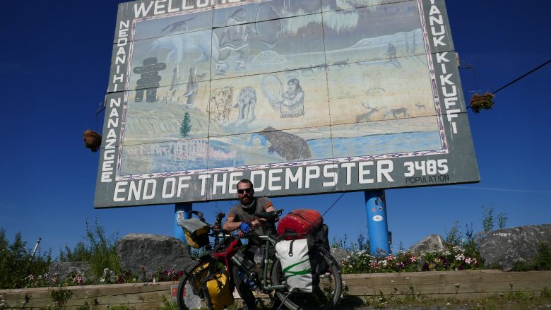 Nach einer Nacht direkt am Fährhafen nahm ich die letzten, ziemlich langweiligen 130 km nach Inuvik unter die Räder. Die Strecke war relativ eintönig und hatte etwa 2 Kurven. Ich hatte zwar endlich mal kein Wind mehr, wünschte mir aber diesen nun sehnlichst zurück: Auf dieser Strecke wurde irgendwas an der Strasse gebaut und daher fuhren gefühlte 1000 Lastwagen mit Vollgas über die Piste und wirbelten Unmengen an Staub auf. Da es heute windstill war, blieben die Staubwolken dann leider auch minutenlang über der Strasse hängen was das Velofahren nicht sehr angenehm machte. Aber ich bin dann noch mal noch in Inuvik angekommen. Alles in Allem war das dann doch gar nicht so eine wilde Sache dieser Dempster 😀