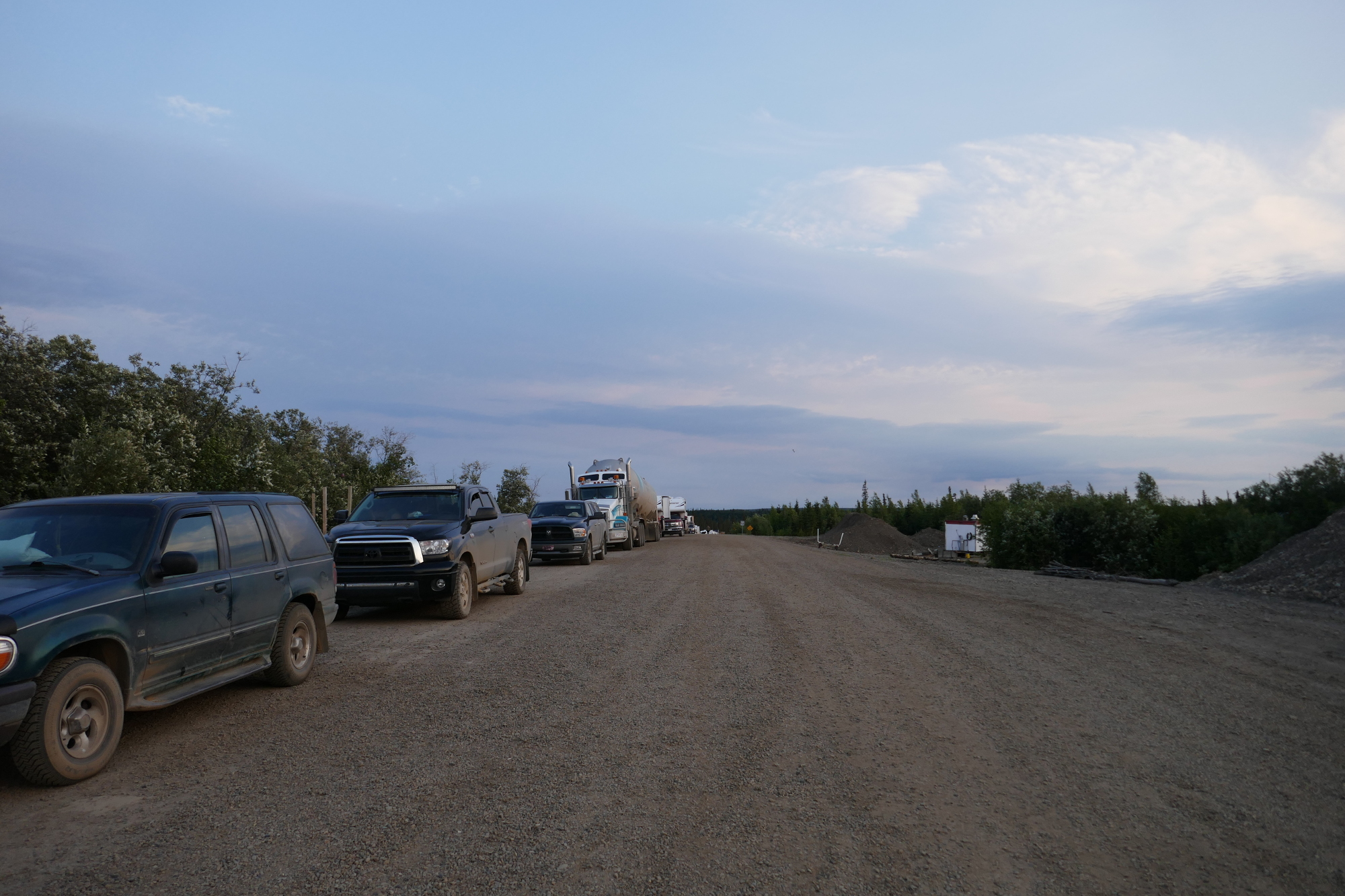 Nach und nach wurde die Schlange an der Fähre immer länger und gegen Abend waren dann wohl so um die 50 Trucks, Camper und Autos da, welche alle auf die kleine Fähre wollten. So verwandelte sich halt der Highway langsam aber sicher zu einem improvisierten Campingplatz. So traf ich dann auch auf John & Jan from Denver, welche mit dem Camper gegen Inuvik wollten. Die beiden kümmerten sich dann gut um mich und schauten dass ich warm, Kaffee, etwas zu Essen und zum Lesen hatte.