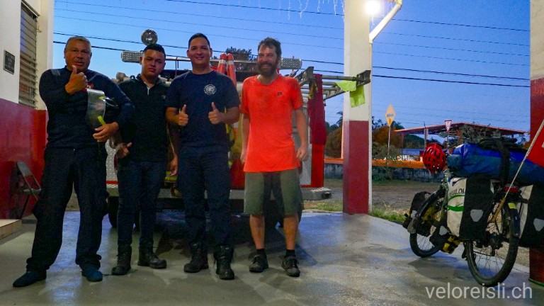 Und wieder einmal waren die ersten Kilometer im neuen Land besonders. Hier war es plötzlich still, kein Krach, kein Gebell, keine Scheppermusik. Am Strassenrand lag kein Müll und die Autos stanken etwa genau so wie auch bei uns in Europa – Herrlich so Velo zu fahren. Ich radelte noch gemütlich bis ins Städtchen La Crux. Ich stoppte vor einer grossen, neuen und modernen Feuerwehrstation und bat um Asyl für die Nacht. Aber nix da, in Cota Rica weht ein anderer Wind. So wird mir auch später im ganzen Land nie erlaubt bei Feuerwehr oder Rotem Kreuz zu nächtigen. Zum Glück ist aber der Nachbar gerade damit beschäftigt, die Sports Bar von La Crux umzubauen und lässt mich kurzerhand in der Küche des Restaurants übernachten. Wie treffend, dass der Herr aus Nicaragua stammt 🙂